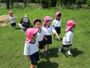 初めてさくら組でお散歩に行きましたが、お友だちと手を繋ぎ、春の植物をみながら歩いていました。