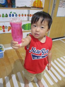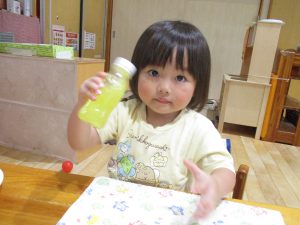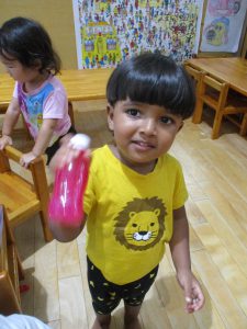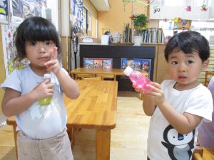 「あかがいいー!」「キラキラだね!」と、保育者が作る様子を見て楽しんでいました♡