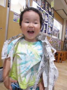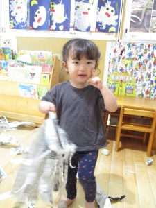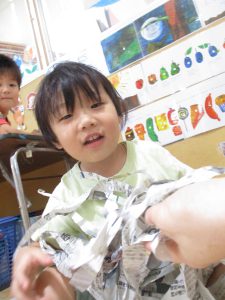 細かくちぎった新聞紙を雪のように降らすと、「キャー!」と大はしゃぎでした!