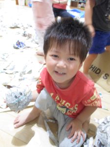 新聞紙遊びでは、割いたり丸めたり、指先を使って楽しんでいました。