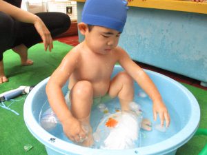 プール遊びの時、花の入った花氷や水風船氷でも遊びました。