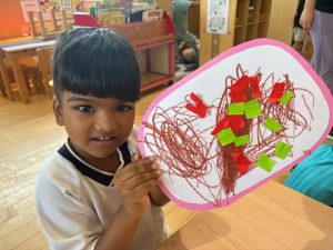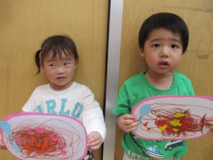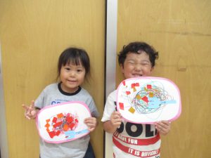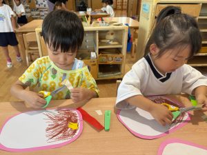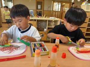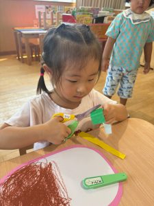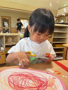 製作をするのが大好きな子ども達!はさみにも興味を持ち、少人数ずつはさみの持ち方や切り方を確認しながら行いました。