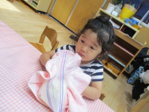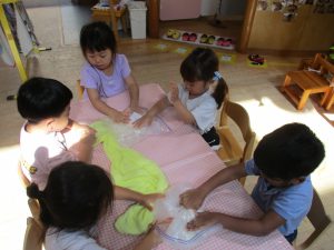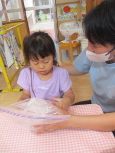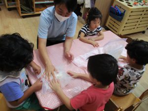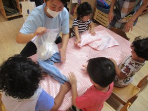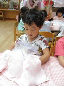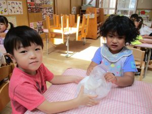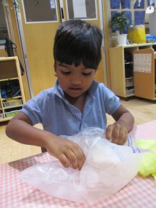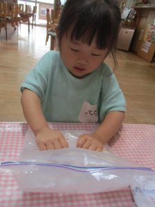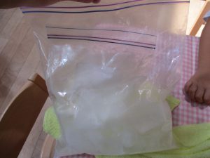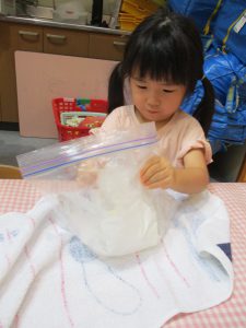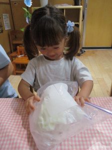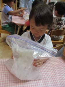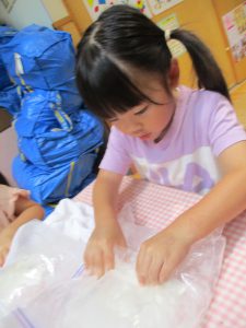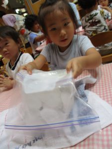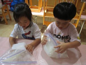 氷の袋に塩を入れると、さらに冷たくなって「冷たいね~」「はやく食べたいね!」など言いながらアイスが固まるように頑張っていましたよ♪