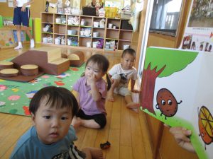 絵本が始まると、「もういいかい~」「まーだだよ」