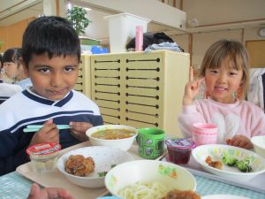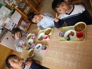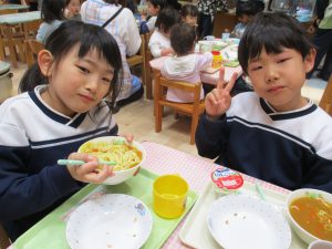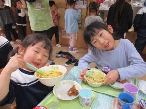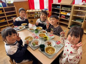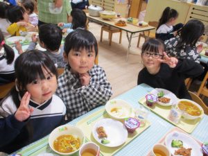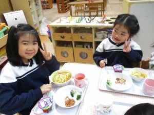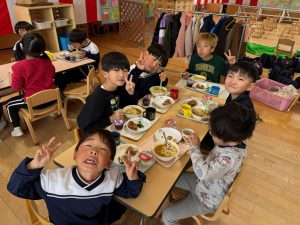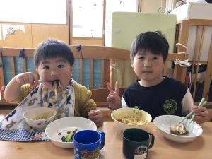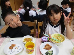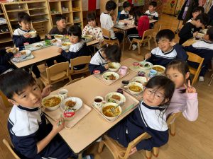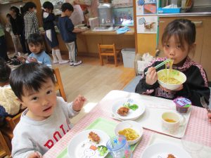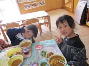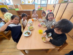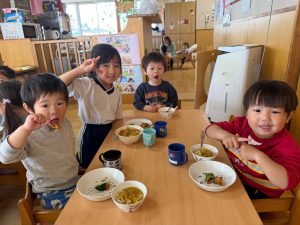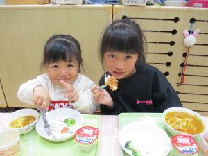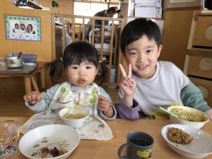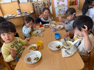 給食を食べました。未満児さんのクラスではお着替えなどもお手伝いしてきましたよ