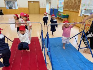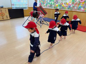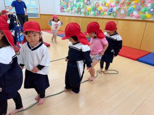 走ったり、鉄棒にぶら下がったり、紐の上を歩く線渡りをしました。