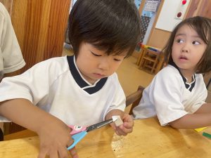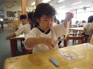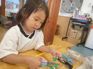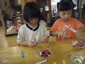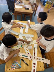 好きな色4色選んで切り、貼り付けて行きました。廃材などでの工作も好きなお友だちが多く、夢中で作っていました。