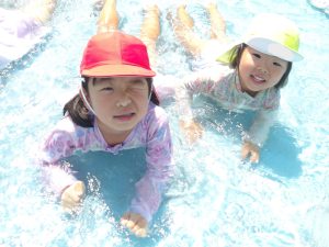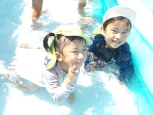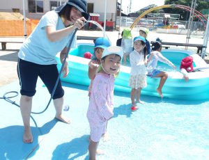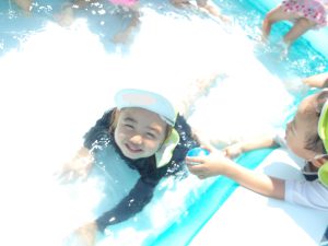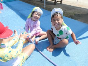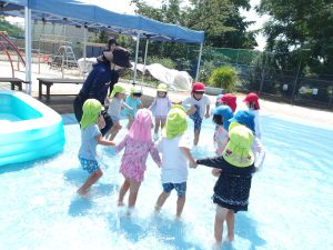 今日は異年齢のほし・そら・にじグループに分かれて水遊びをしました♪