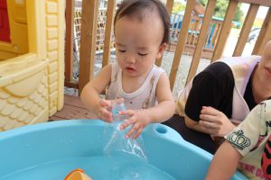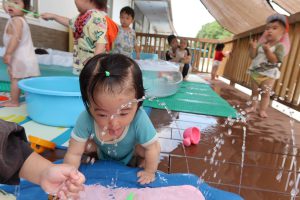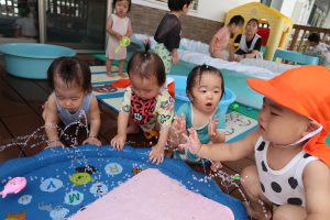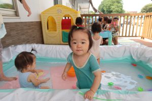 その後はうさぎ組、ひよこ組のお友だちみんな一緒に大きなプールで水遊びを楽しみましたよ。