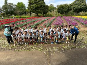 チューリップの前で集合写真を撮りました!