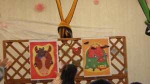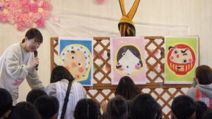 今日はお誕生日会があり、お楽しみとして先生たちが福笑いをしました。