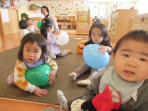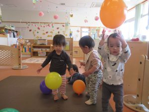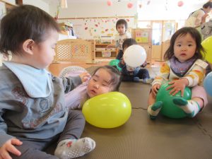 今日は風船遊びをしました。風船の上に乗ってみたり、投げたり蹴ったりして遊んでいました。