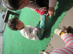 その後、人工芝ではシャボン玉を保育士が吹くと、飛んで行くシャボン玉を追いかけて喜んでいました。