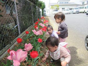 また、散歩車に乗って駐車場に行き、チューリップを見たり、保育者とチューリップの歌を歌ったりしました。